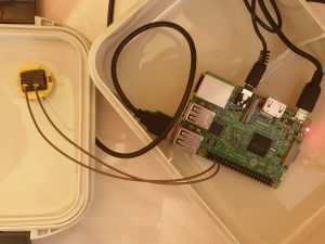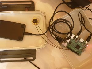 - In den Deckel der Brotdose ein Loch bohren und den Schalter einrasten. Die Jumperkabel mit dem Raspberry nach Anleitung verbinden. Ein kleines Loch für den Micro-USB-Anschluss und die Lautsprecher in die hintere Ecke bohren.