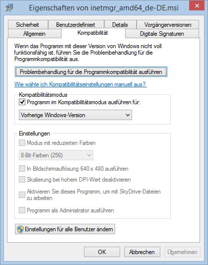 Nun muss die extrahierte inetmgr_amd64_de-DE.msi im Kompatibilitätsmodus installiert werden.