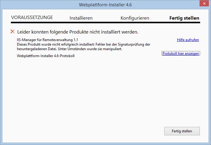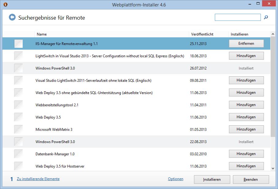 AdministratorDer IIS-Remote-Verwaltung Manager fehlt unter Windows 8.1. Das Installationspaket erhält man am einfachsten über den Webplattform-Installer.