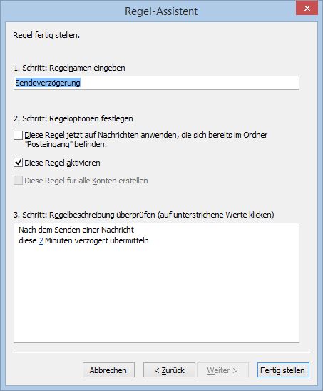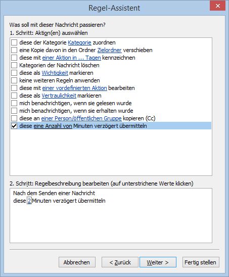 AdministratorIm Onlinebetrieb werden Nachrichten sofort abgeschickt. Oft fällt einem jedoch nach einer Minute noch etwas ein. Jetzt kann man sich mit einer Regel noch etwas Zeit verschaffen.