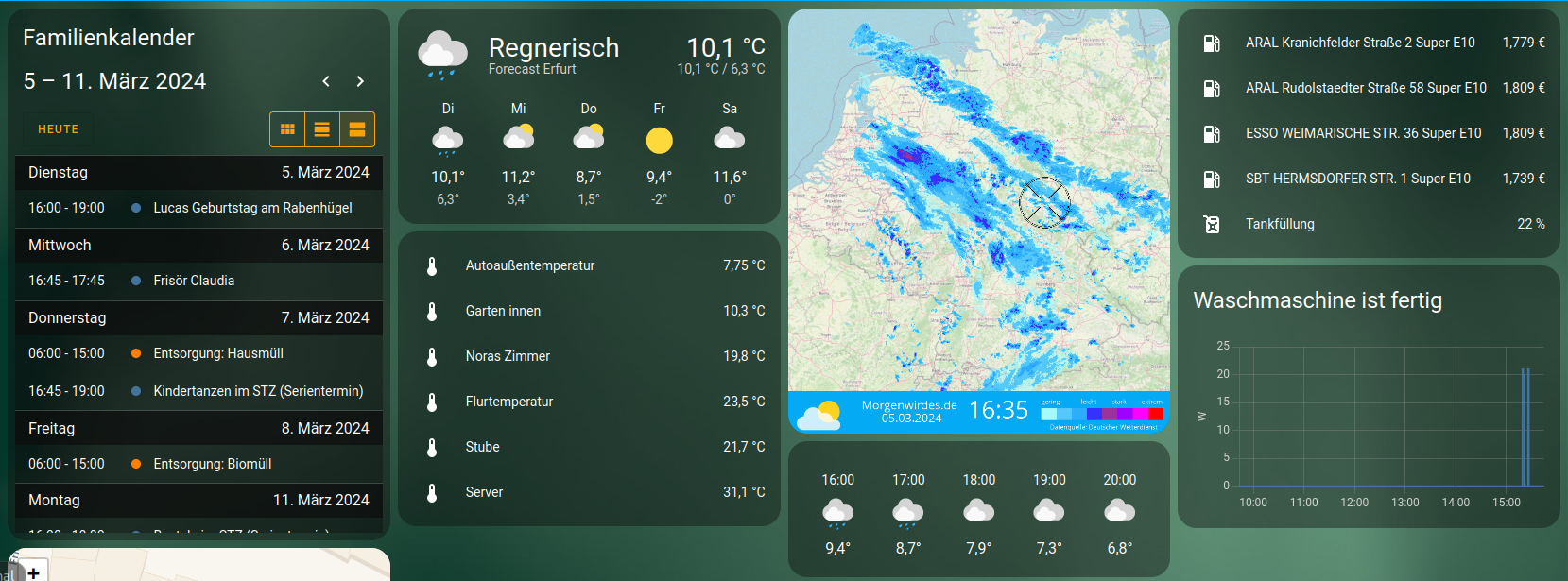 Wir haben den Familien-, Event- und Schulkalender von Outlook, die Foursquare-CheckIns über ein Script, den Abfallkalnder durch hausmuell.info und die Schulferien von feiertage-deutschland.de.