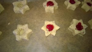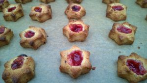 Husarenbusserl Zutaten: 500 g Mehl (Weizenmehl) 1 g Ei 200 g Zucker 1 Pckg. Vanillezucker 100 g Haselnüsse (gemahlen) 350 g Butter (weich) 1 c Himbeermarmelade (zum Füllen) 50 g Puderzucker (zum Bestäuben) Anleitung: Die Zutaten in einer Schüssel verrühren. Anschließend den Teig dick ausstechen oder von einer Rolle 2 cm dicke Scheiben abschneiden. Den Backofen bei Umluft auf 170 °C vorheizen. Mit einem Kochlöffelstiel Mulden in den Teig stechen und die Marmelade einfüllen. Die Plätzchen 12 Minuten backen und nach dem Abkühlen mit Puderzucker bestäuben. Beschreibung: Husarenbusserl