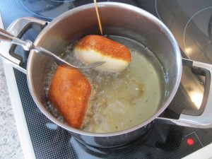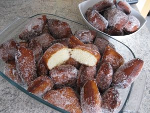 Kräpfelchen Zutaten: 500 Mehl 1 Hefe 150 Zucker 1/2 Sana 1 Ei 1 Salz 2 Schweinefett Anleitung: Alle Zutaten vermischen und den Teig an einem warmen Ort gehen lassen. Dabei das Mehl wie gewünscht durch Quark ersetzen. Nach ca. 1 Stunde Streifen schneiden. Das Schweinefett in einem Topf oder Fritteuse erwärmen und immer 3 Kapfen schwimmen lassen. Wenn sie schön braun sind auf einem Metallsieb kurz abtropfen lassen und zuckern. Beschreibung: Kräpfelchen mit Quark