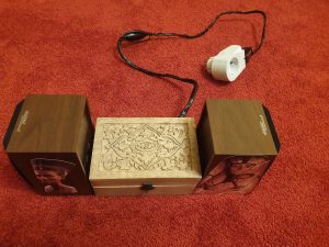 Die Box sieht durch ihr Retro-Design einfach schön aus. Sie eignet sich zum Beispiel besonders gut für das Badezimmer. Legt man eine RFID-Karte auf, geht das Hörspiel an der Stelle weiter, wo man aufgehört hat. Per Drehregler kann man die Lautstärke steuern aber auch per Handy kann man z.B. zum nächsten Titel springen. Eine RFID-Karte mit der Lieblingsplaylist ist zu empfehlen, sie lässt sich einfach erweitern indem man weitere mp3-Dateien in die entsprechende Windows-Freigabe kopiert.